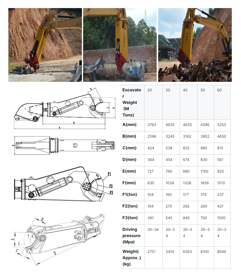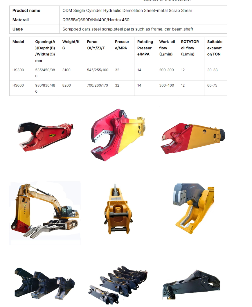 The shearer rotates in both directions, with high power hydraulic pressure, saving labour time and improving working efficiency; it is suitable for dismantling of scrap cars, shearing of steel parts such as frames, beams and axles, and shearing of scrap steel in steel yards.