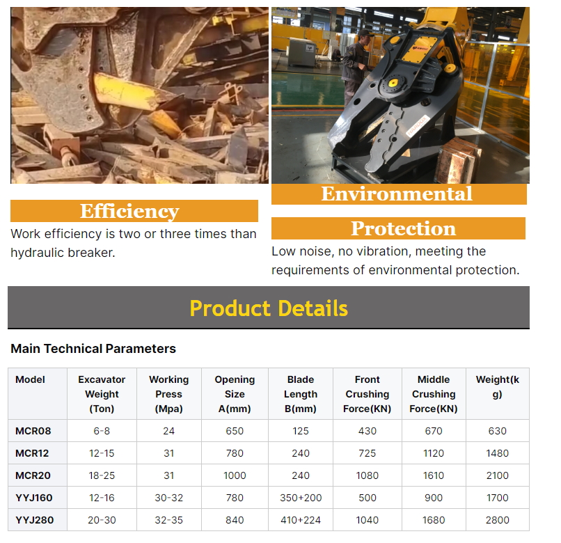 The shearer rotates in both directions, with high power hydraulic pressure, saving labour time and improving working efficiency; it is suitable for dismantling of scrap cars, shearing of steel parts such as frames, beams and axles, and shearing of scrap steel in steel yards.
