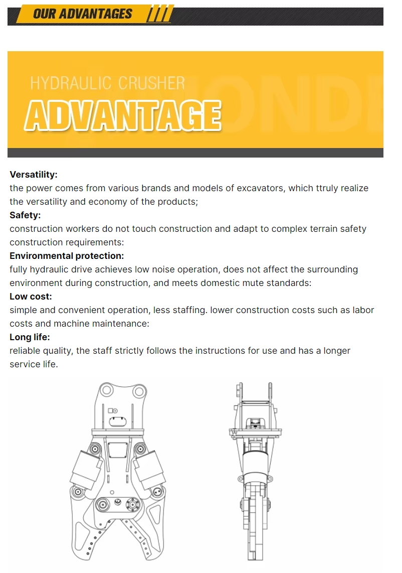 Excavator multifunctional hydraulic cutter is the ideal tool in the rescue process. Double oil cylinder body is equipped with a variety of different structure of jaw, realizing the separation, shearing removing in the rescue process. Double oil cylinder is with large opening design, so the work is easy, convenient, flexible, and ensures powerful motivation of equipment. Work efficiency is two to three times of broken hammer.