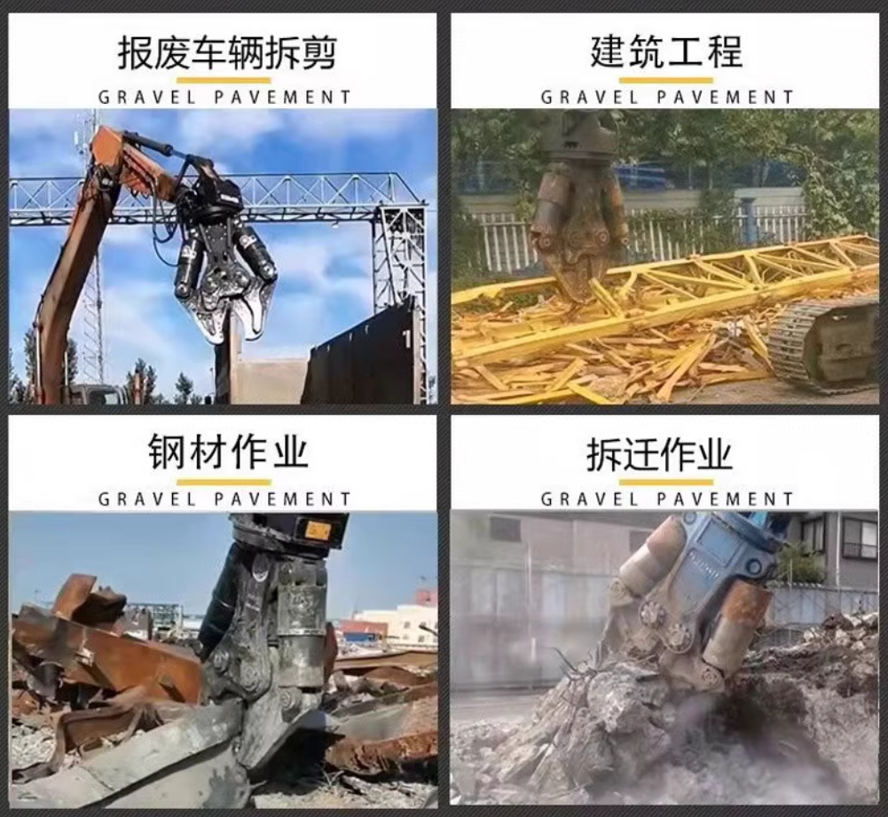 The shearer rotates in both directions, with high power hydraulic pressure, saving labour time and improving working efficiency; it is suitable for dismantling of scrap cars, shearing of steel parts such as frames, beams and axles, and shearing of scrap steel in steel yards.